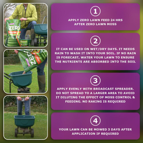 • For a rich, green lawn, apply Zero Lawn Feed 24 hours after using Zero Lawn Moss